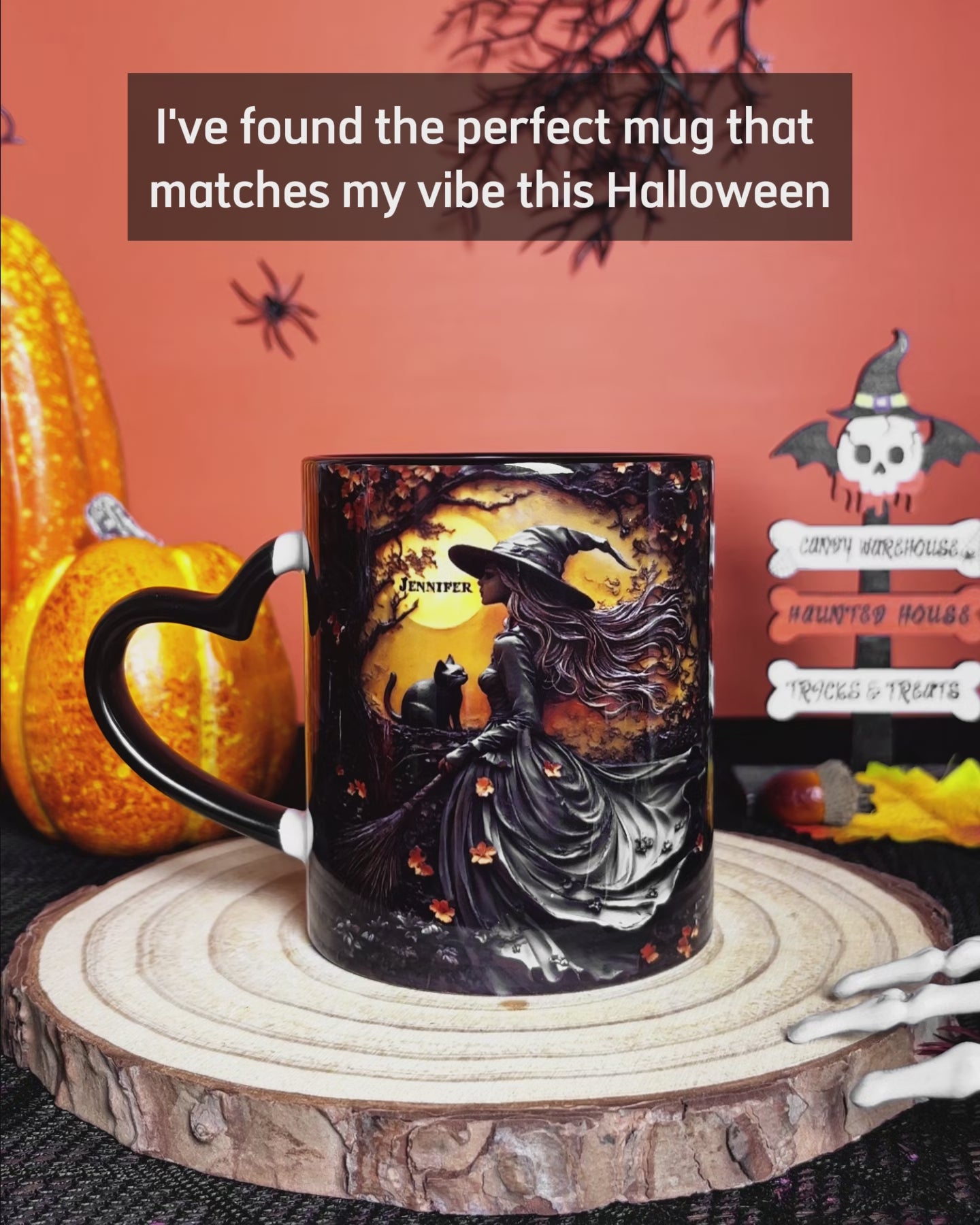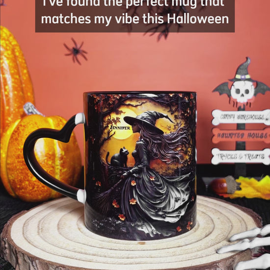 Beautiful Witch & Her Black Cat - Personalized Witch Heart Handle Mug