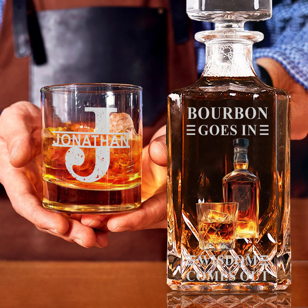 Bourbon Whiskey Goes In Wisdom Comes Out - Personalized Whisky Whiskey Decanter Set