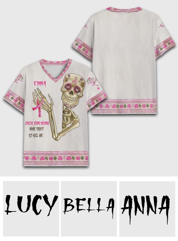 Check Your B, Mine Tried To Kill Me - Personalized Breast Cancer Awareness Fully Printed V-Neck T-Shirt