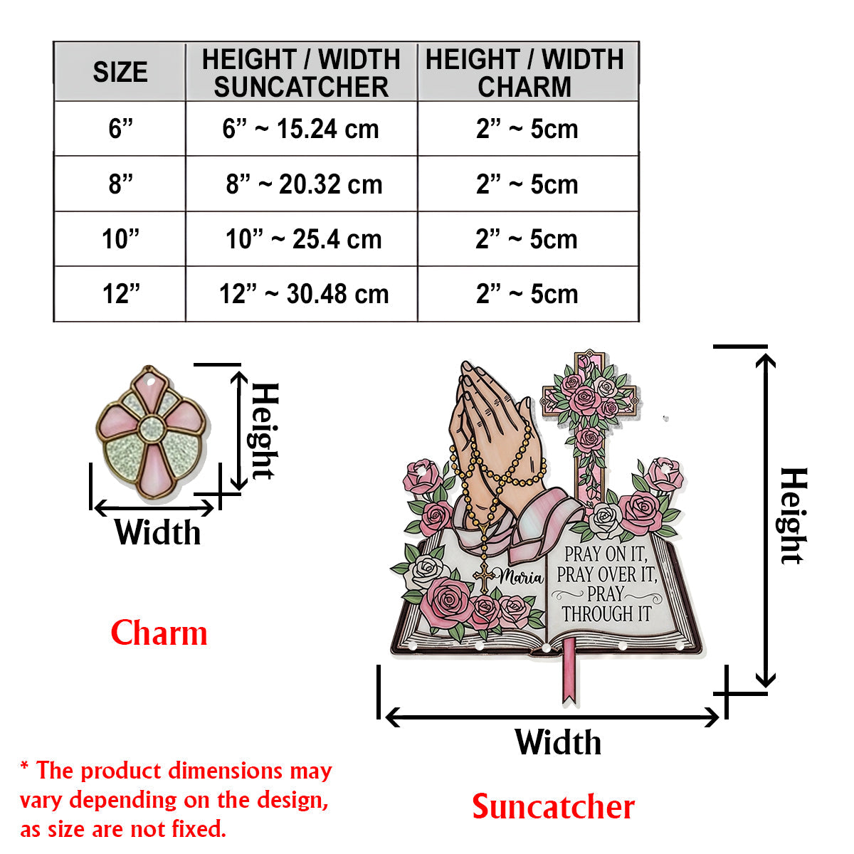 - Suncatcher Sizes: Available in 6in (≈ 15.2 cm), 8in (≈ 20.3 cm), 10in (≈ 25.4 cm), and 12in (≈ 30.4 cm) for a personalized touch.