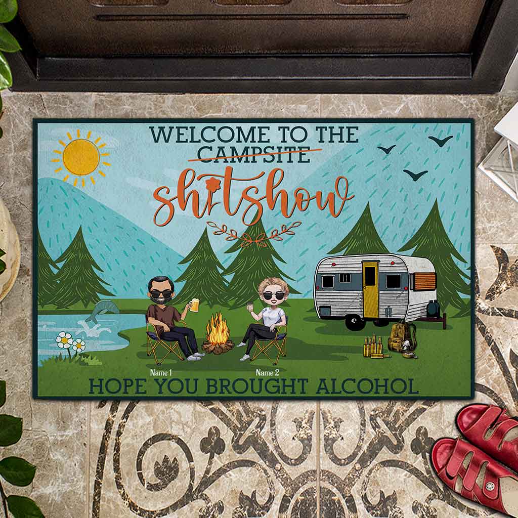 Welcome To The Shitshow Brought Alcohol - Personalized Camping Doormat